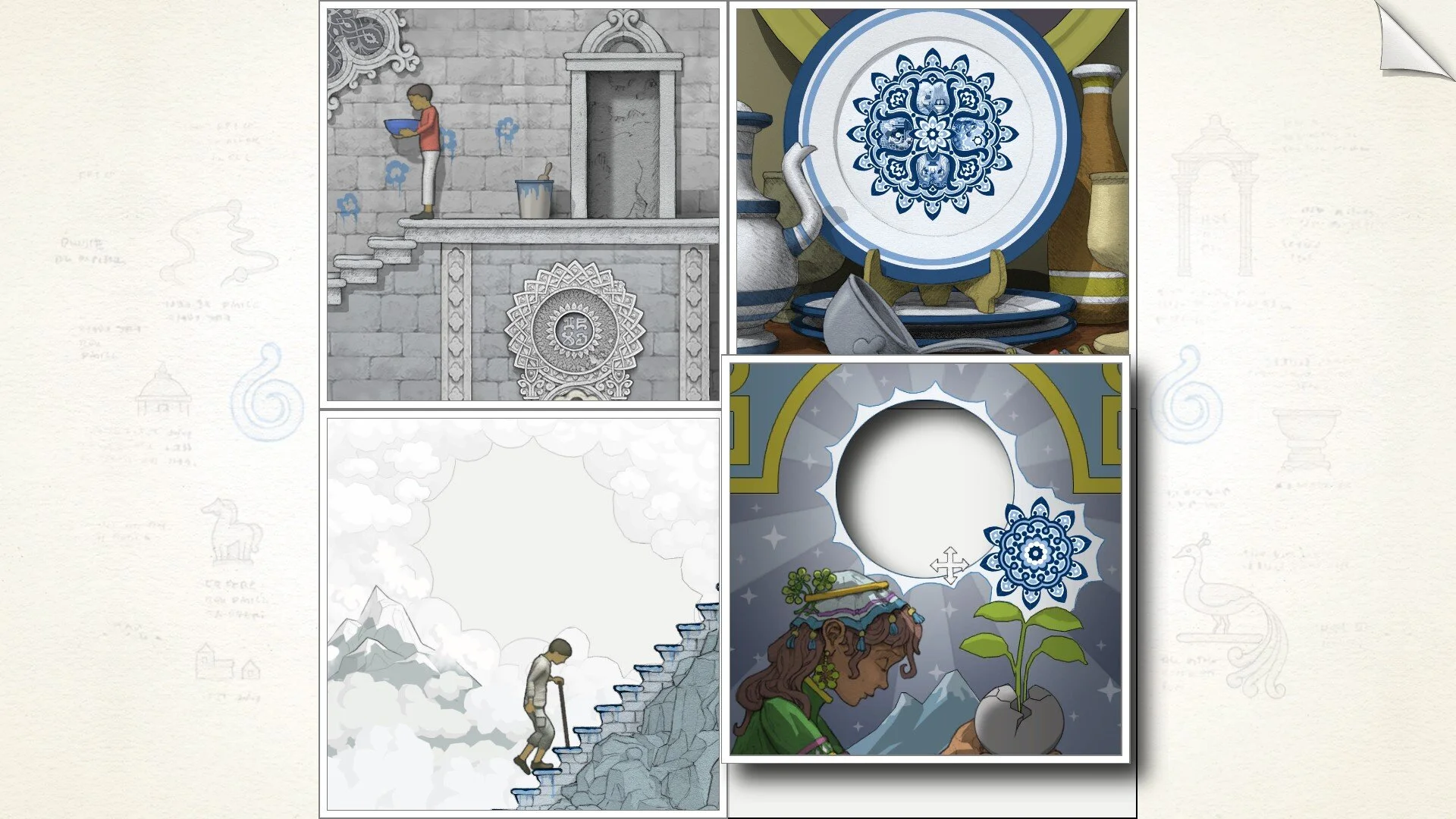 Of course that's just one small example that I probably got wrong, but hopefully it explains how Gorogoa approaches its puzzles. It's only by shifting around each panel on the screen that any progression can be made. Often it's as simple as moving an empty doorway onto a closed room so the boy can walk outside, but at best you'll be keeping track of multiple levels of detail.